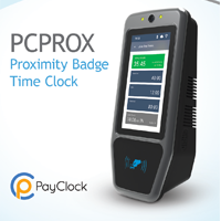 It's so easy to record and manage your employee time and attendance with PayClock and the PCPROX time clock. The time clock has a proximity badge reader and interactive 7” LCD touch screen interface that lets employees’ clock in & out, change departments, add amounts, check their totals, and more. Managers can view their employees’ in or out status in the employee list, send messages and override schedule restrictions and do even more functions as well. The clock’s seamless connectivity to PayClock software lets employees, managers, and admins perform and view all of these transactions right at the time clock!