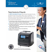 The Pyramid 5000 is a calculating time clock for up to 100 employees. It totals weekly, bi-weekly, semi-monthly, or monthly pay periods. Totals actual or rounded time, including 0, 5, 10 and 15 minute rounding. Auto-feeding time card alignment ensures quick & precise time card punches. Compact, sleek design complements any work environment. Simple set-up and simple operation make this time clock a favorite with small business!